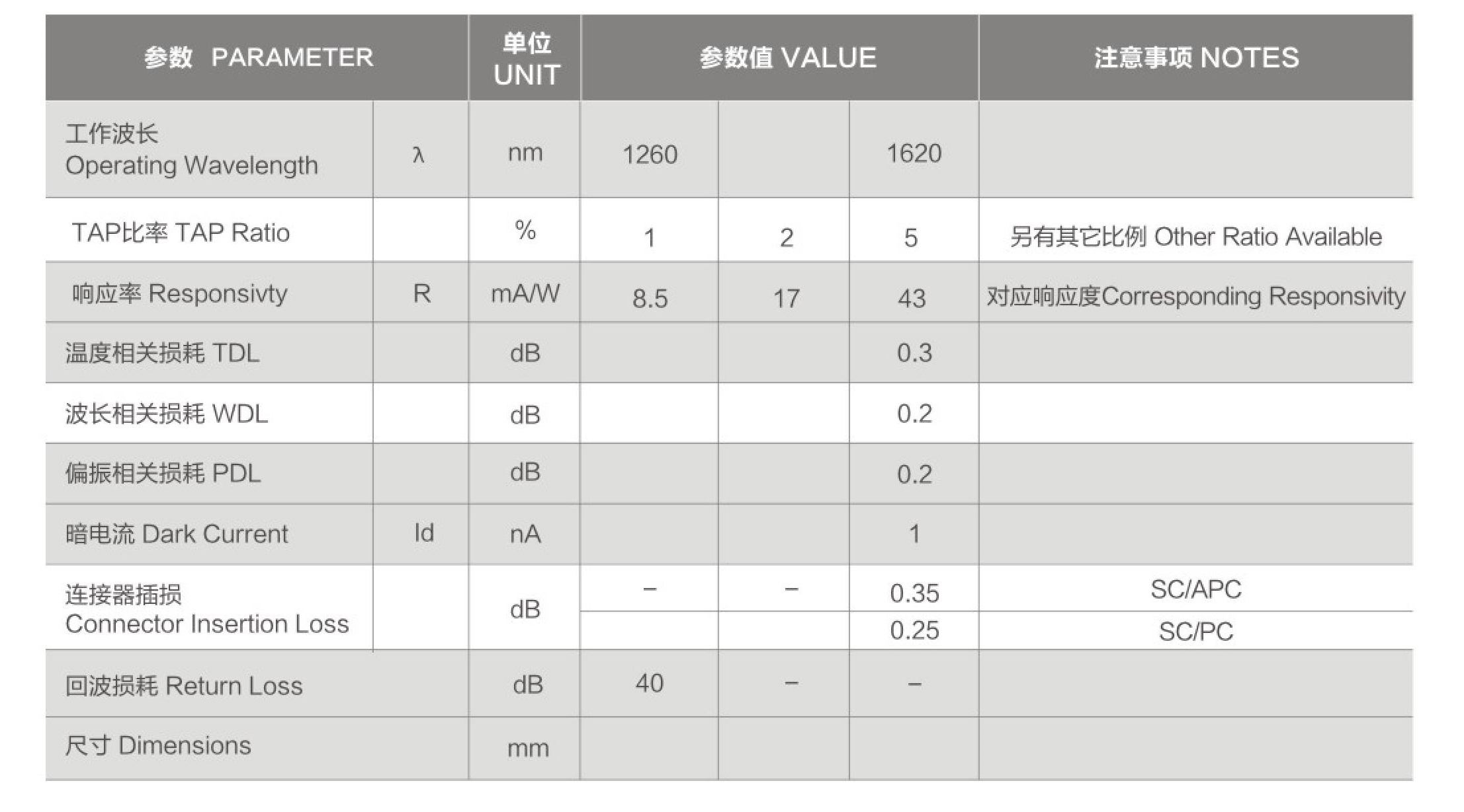 雙芯尾纖式結構,實現(xiàn)一定比例的光透射到探測器,其余的光反射到另一根光纖。用于WDM網(wǎng)絡監(jiān)控、光纖放大器、光開關等。